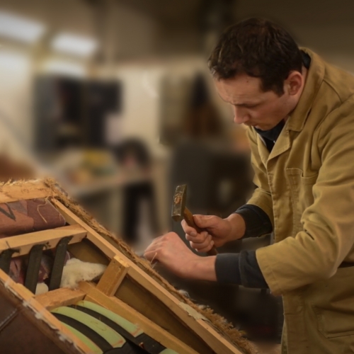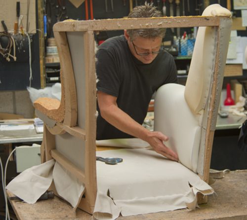 Als het stikwerk klaar is kan de stoffeerder uiteindelijk beginnen met het bekleden van de fauteuil. Zo stilletjes aan begint het weer op een zitmeubel te lijken. Door onze wijze van herstofferen ontstaat een volledig nieuw zitmeubel omdat we van uw oude meubel slechts de romp hebben hergebruikt.
